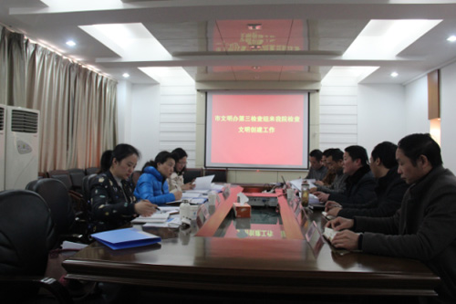 2月13日下午,市文明辦檢查組第三小組在領(lǐng)隊(duì)、市文明辦辦公室主任王曉群帶領(lǐng)下,對我院申報(bào)創(chuàng)建第十一屆市文明單位進(jìn)行檢查驗(yàn)收。檢查組首先聽取了賀玉龍?jiān)洪L代表我院所作的創(chuàng)建工作匯報(bào),隨后按照《第十一屆滁州市文明單位測評細(xì)則》對我院申報(bào)創(chuàng)建材料進(jìn)行了認(rèn)真的查驗(yàn),并對我院辦公及周圍環(huán)境進(jìn)行了實(shí)地查看。副院長丁文軍、王士才、黃明華、袁家金和院文明創(chuàng)建領(lǐng)導(dǎo)小組辦公室主任季阿祥參加了匯報(bào)會(huì)。